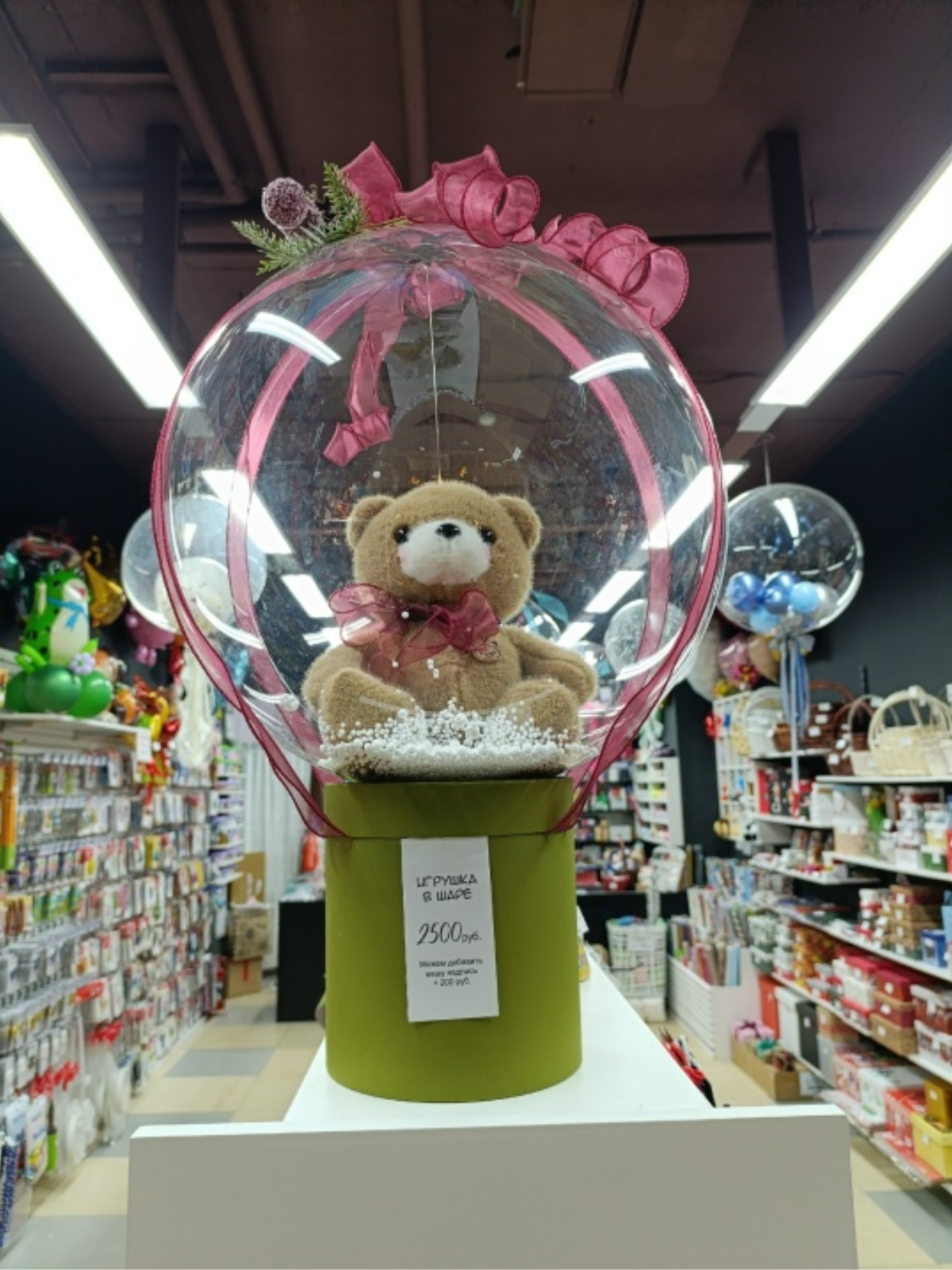Бабл бокс «Медвежонок» — нежный сюрприз с игрушкой внутри прозрачного шара, который подходит для ребёнка или девушки. Такой формат особенно хорошо смотрится для девочки и будет уместен на Новый год, день рождения или другой тёплый семейный праздник.