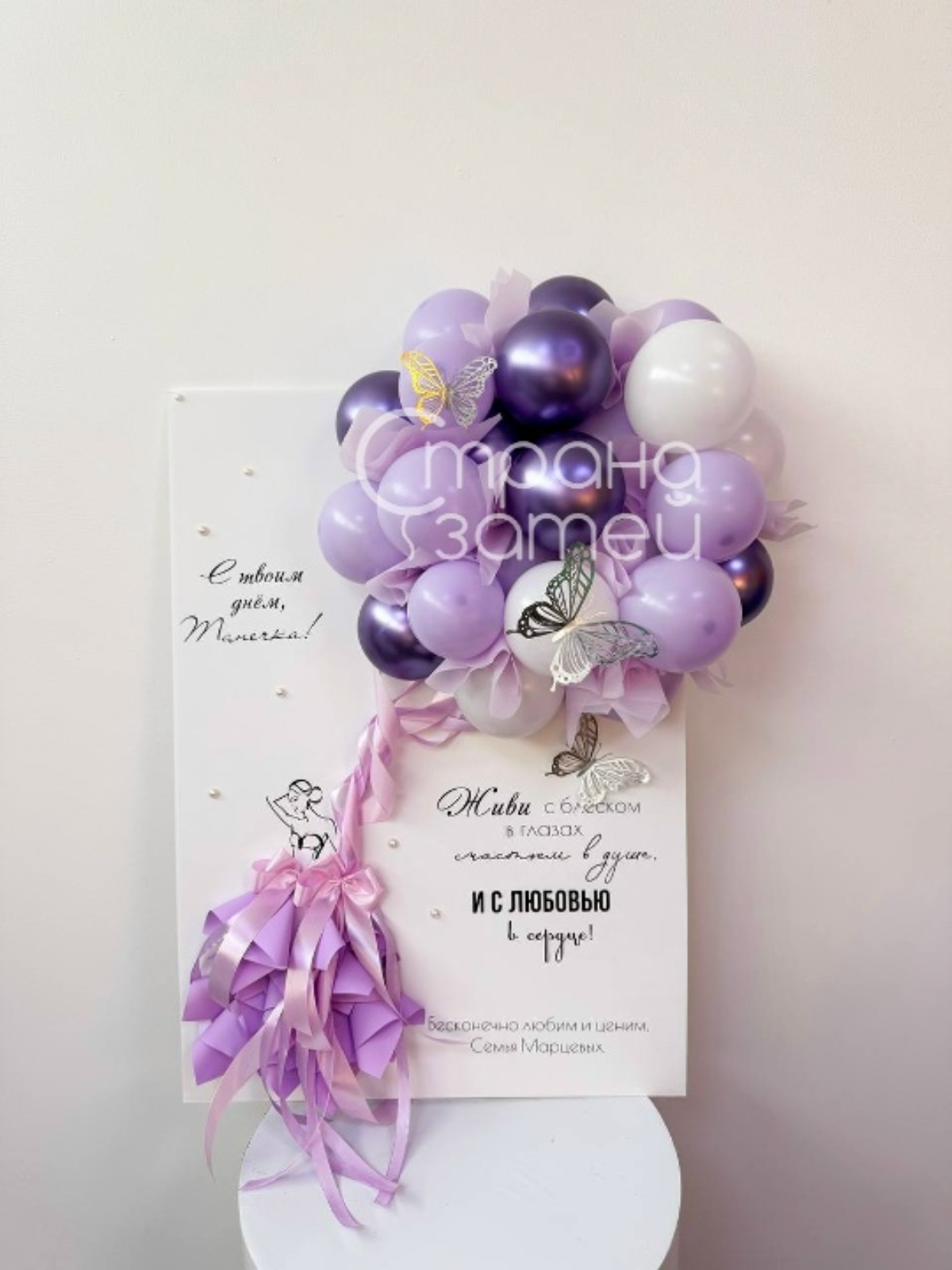 Открытка из шаров «Лавандовая мечта» — красивый подарок на день рождения, который сочетает большую открытку и объёмную композицию из шаров. Такой вариант особенно хорошо подойдёт для неё, а текст и цветовое оформление можно изменить по вашему желанию.