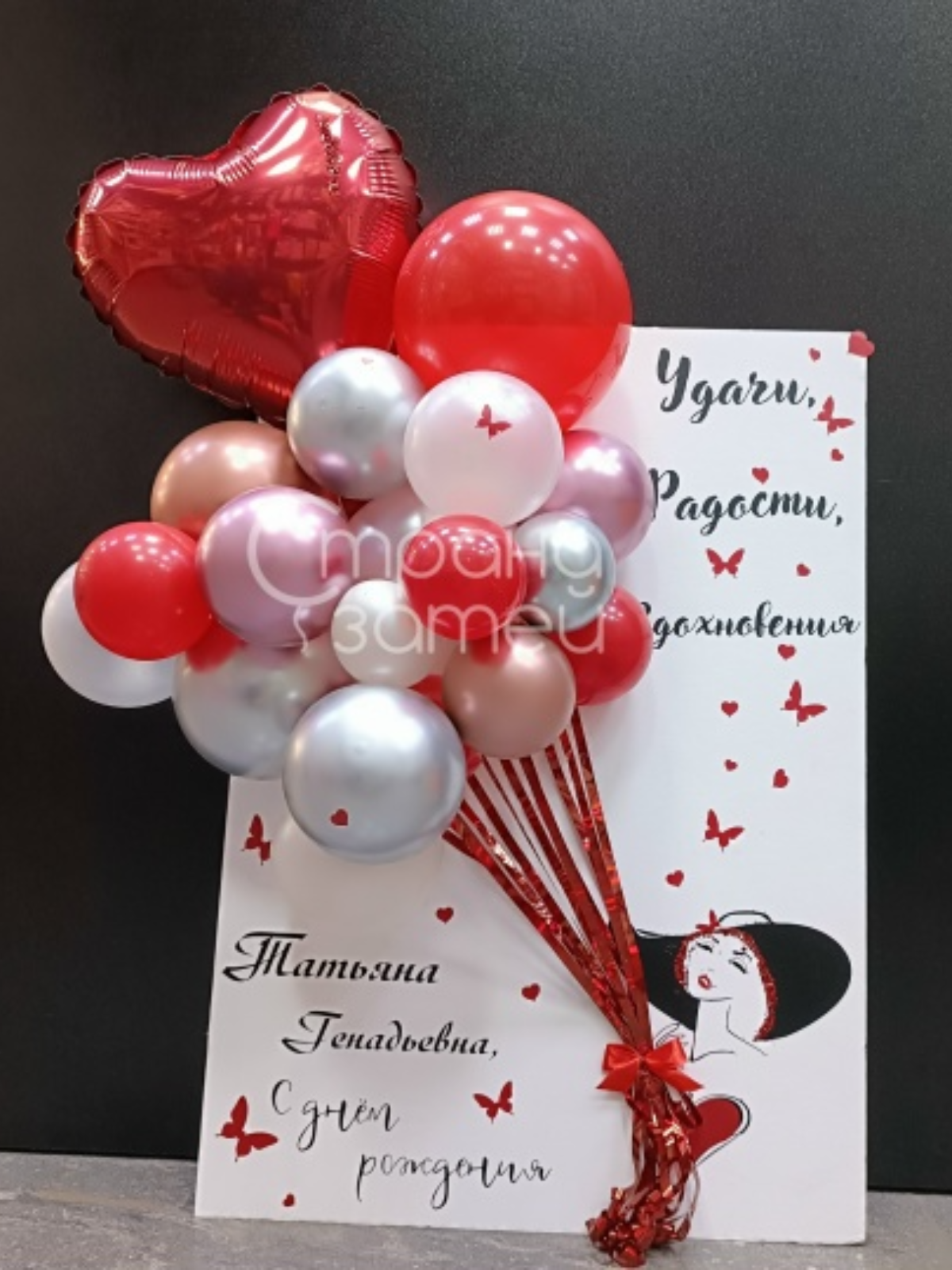 Открытка из шаров «Леди в шляпке» — эффектный подарок на день рождения, который сочетает большую открытку и объёмную композицию из шаров. Такой вариант особенно хорошо подойдёт для неё, а текст и цветовое оформление можно изменить по вашему желанию.