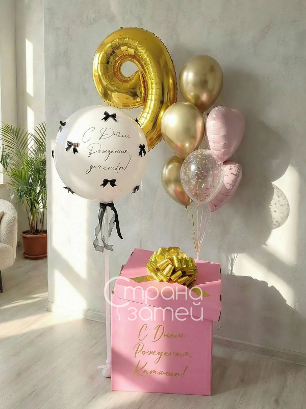 - Большая коробка-сюрприз, шар-гигант с надписью, цифра и розово-золотой фонтан создают вау-эффект и идеально подходят для красивых фото.
