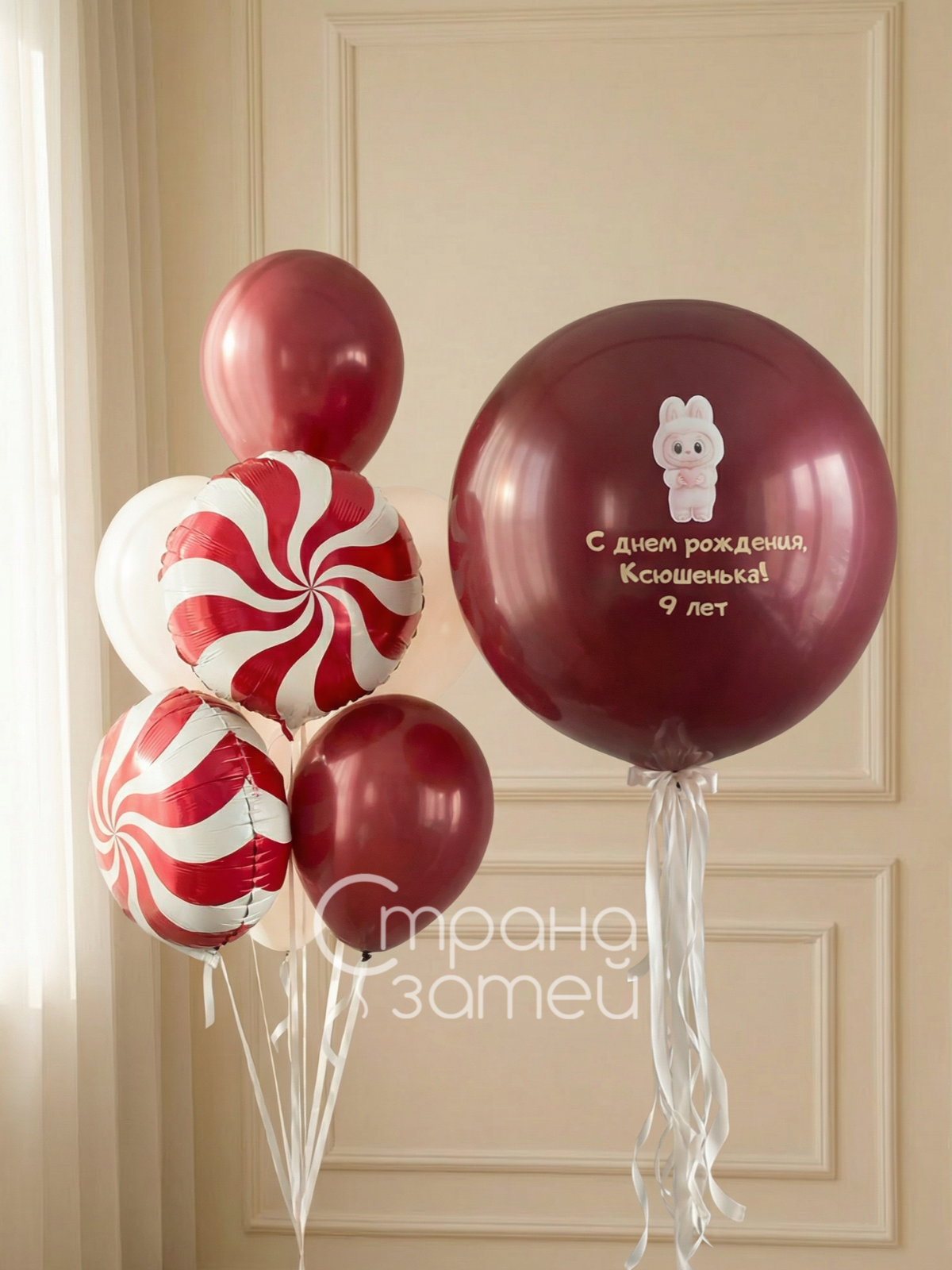 Стильный сет с шаром‑гигантом и карамельными кругами создаёт праздничное настроение и даёт красивые, «вкусные» кадры для фото.