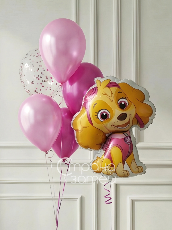 Сет для девочки в тематике «Щенячий патруль»: Скай и аккуратный фонтан из металлика с шаром-конфетти. По желанию можно добавить цифру к возрасту и подобрать оттенки под стиль праздника.