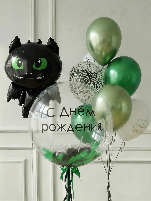 Сет шаров для мальчика на день рождения: дракончик + бабл-шар с вашей надписью и эффектный фонтан с хромом и конфетти. По желанию добавим цифру и подберём оттенки под стиль праздника.