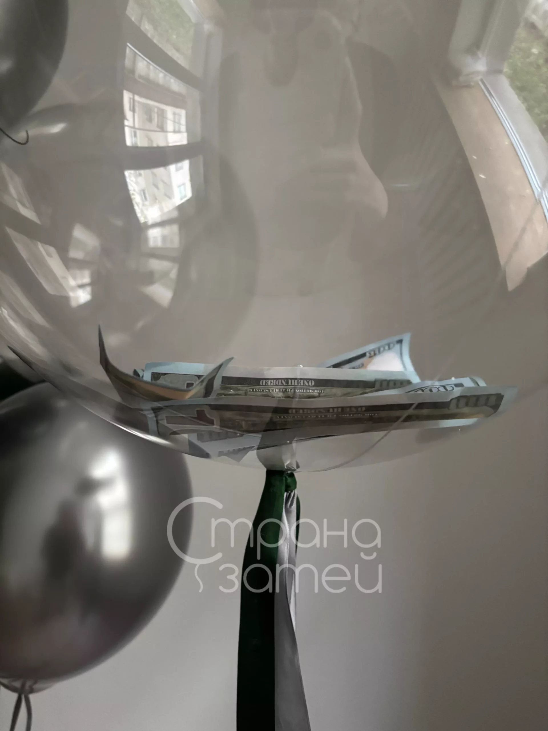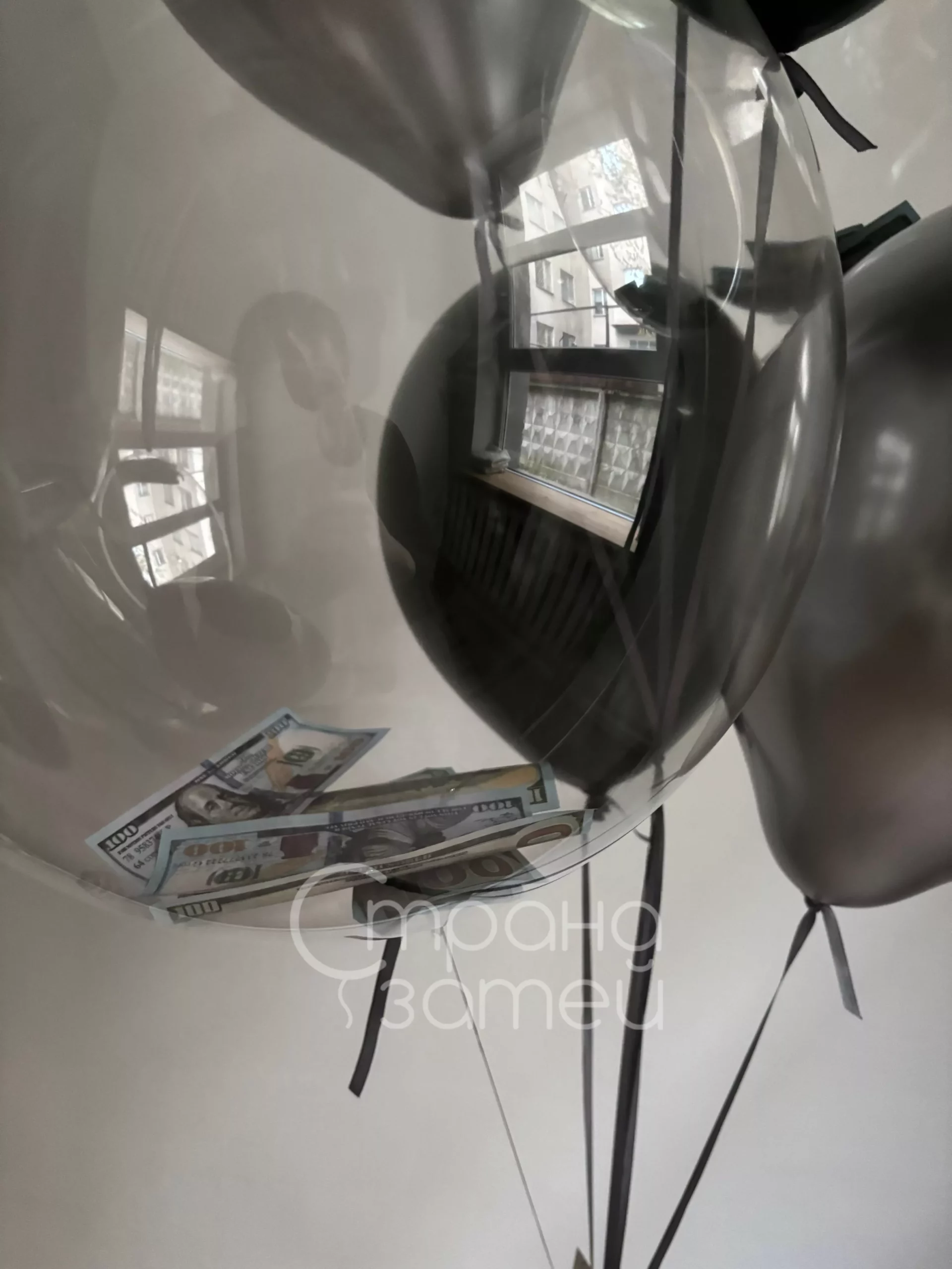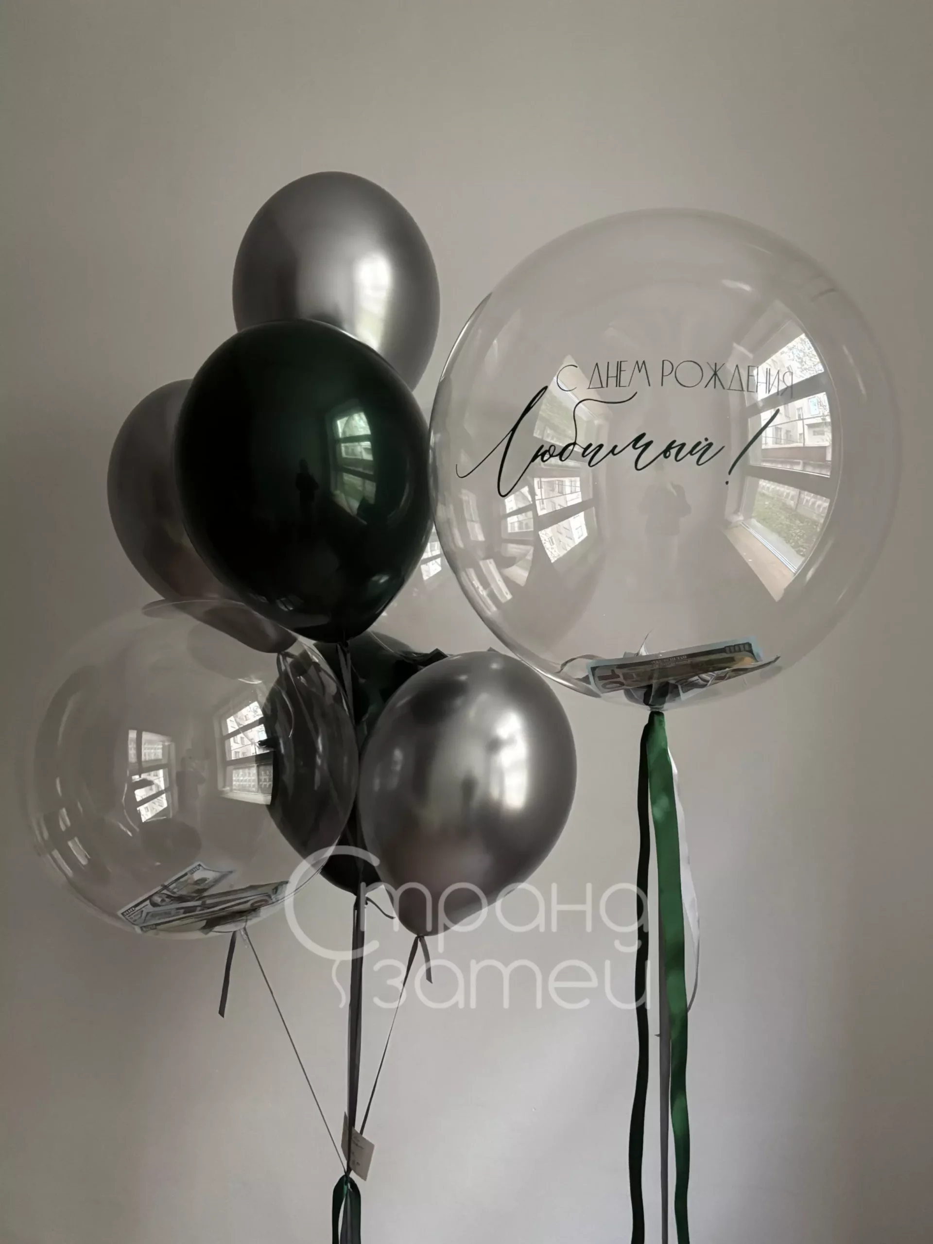 - Фонтан из 8 шаров: 3 хром, 2 дабл шар, бабл 18″ с наполнением