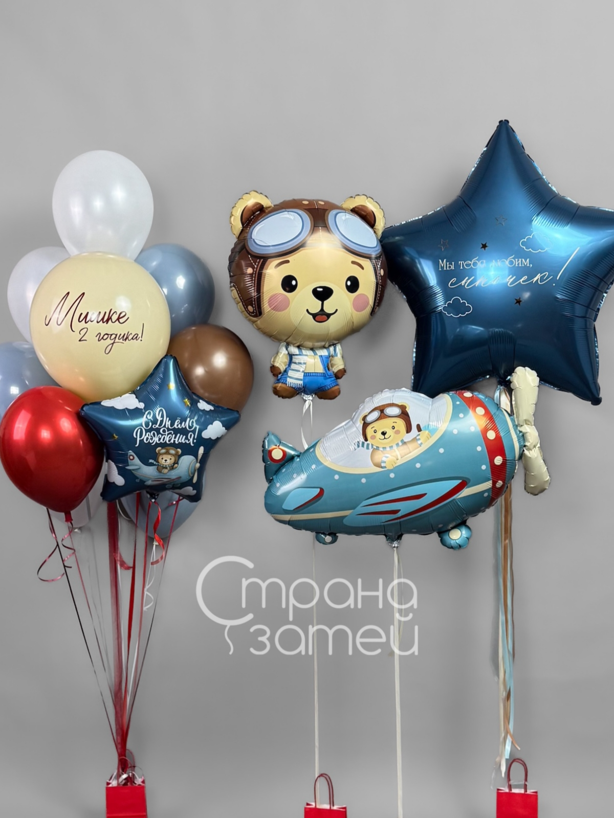 Большая звезда, мишка-пилот, самолёт и фонтан пастельных шаров создают атмосферу полёта и ярко смотрятся на фото.