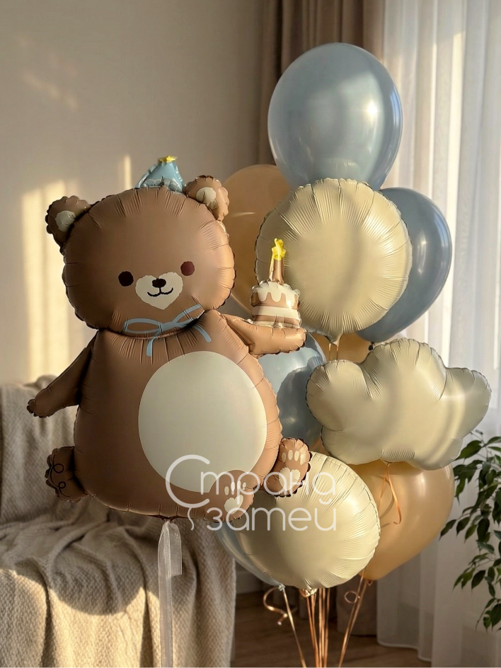 - Фонтан из 10 шаров: 7 пастель, 2 круга 18″, фигура Облако