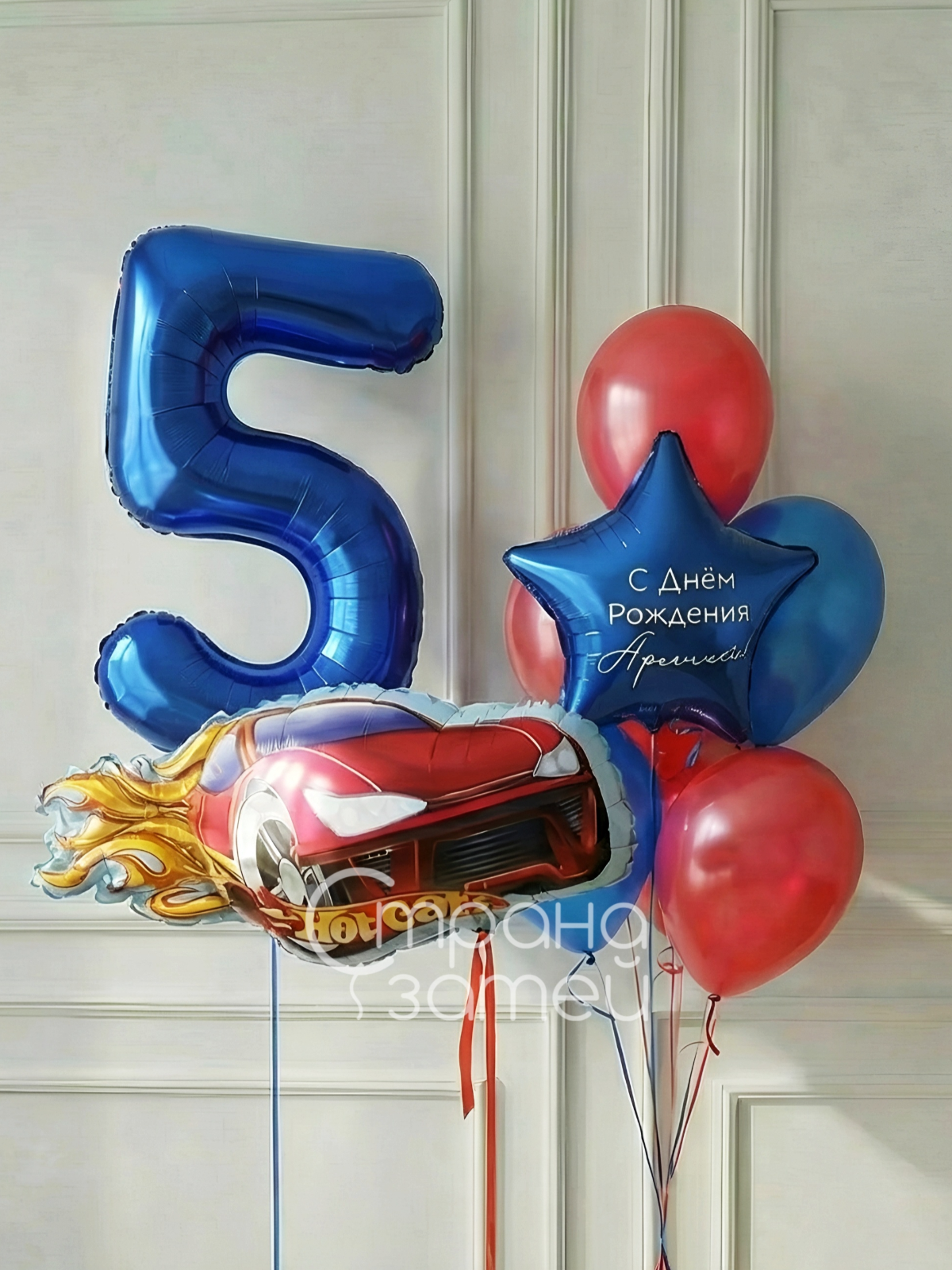 Яркий сет с цифрой, фигурой в стиле Hot Wheels и звездой с надписью — отличный вариант для мальчиков на день рождения. Можно выбрать любую цифру, изменить цвета и текст на звезде.