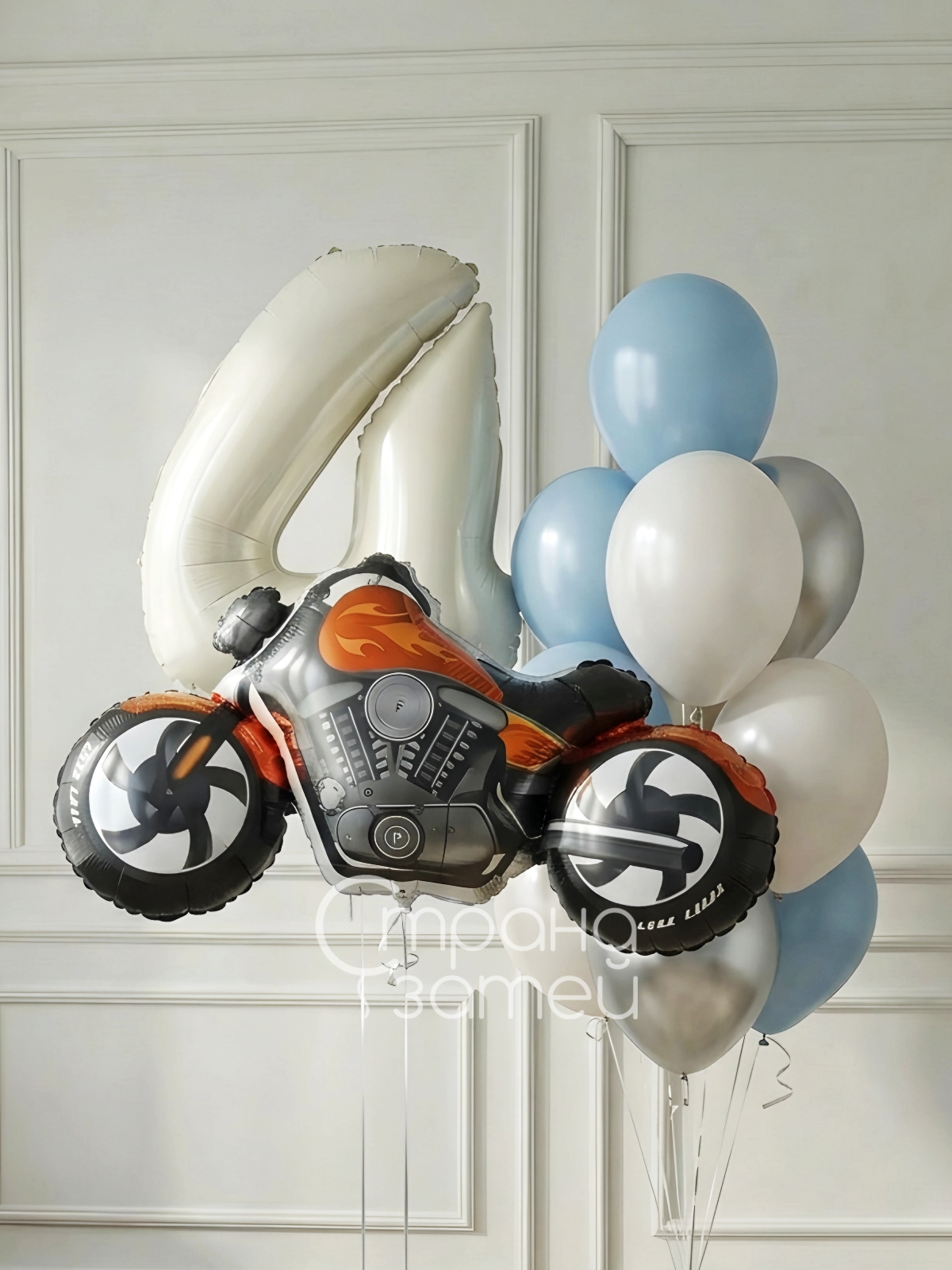 Сет «Мото» для мальчика: фольгированная цифра и мотоцикл создают яркий тематический акцент, а фонтан из шаров красиво дополняет композицию и отлично смотрится на фото. Цифру и цвета шаров можно заменить под ваш возраст и стиль праздника.