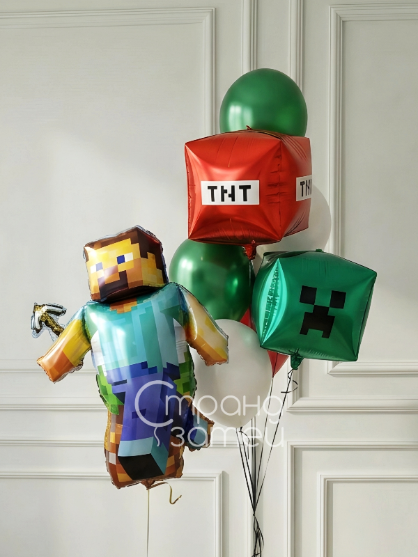 • Фонтан из 7 шаров: куб «Крипер», куб «ТНТ», 3 шара металлик, 2 шара пастель
