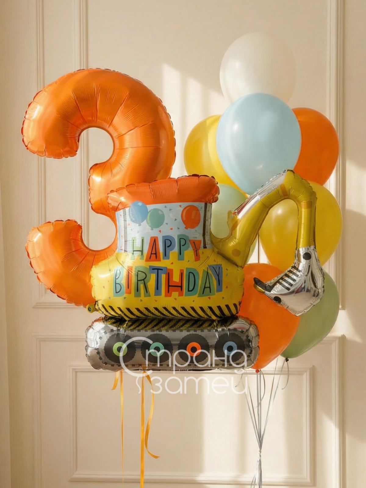 Сет с большой цифрой, экскаватором и пастельным фоном создаёт атмосферу весёлой стройки и отлично смотрится на детских фото.