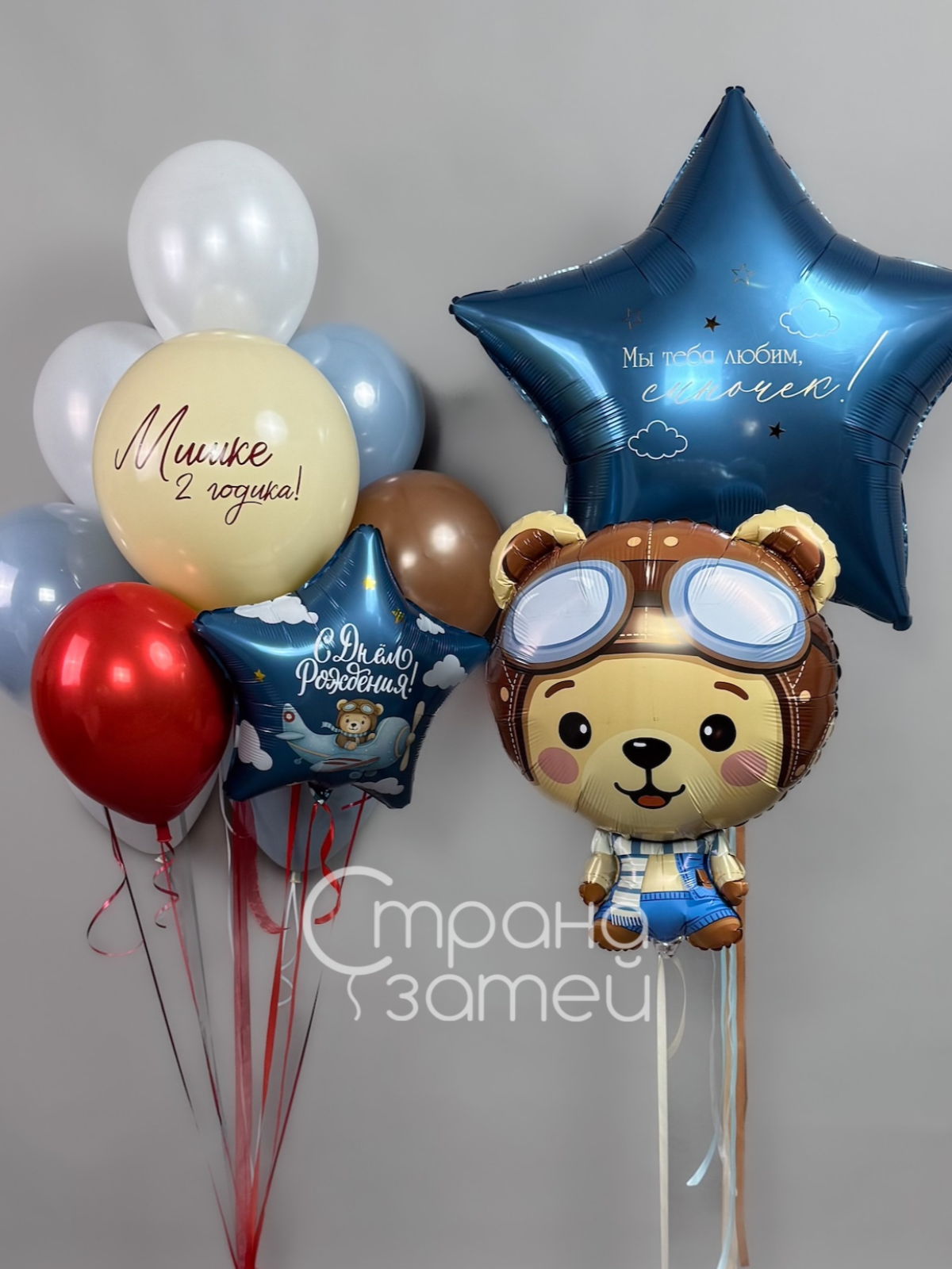 Мишка-пилот, большая звезда и фонтан пастельных шаров с надписями создают воздушное настроение и красиво смотрятся на фото.