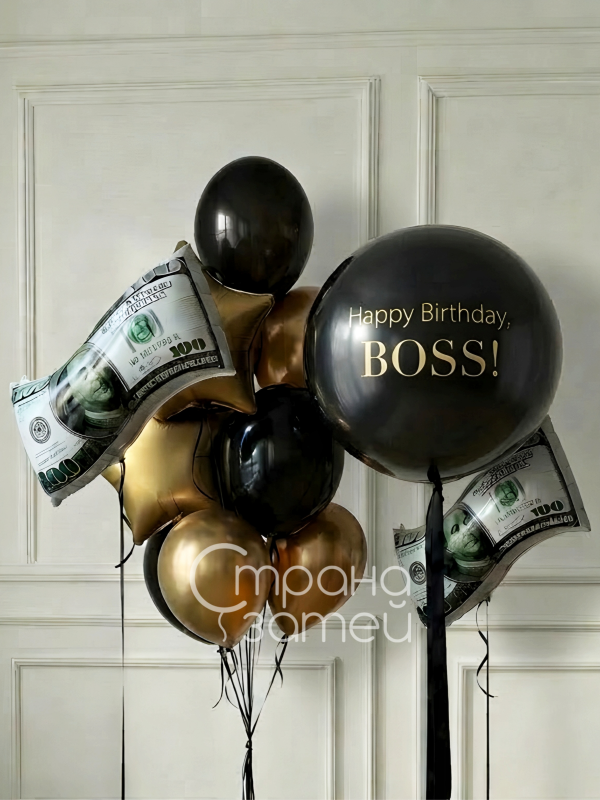 Сет шаров «Босс на миллион» — эффектное поздравление для него: Двойной шар-гигант с надписью, фигуры «доллар» и фонтан в чёрно-золотой гамме. Надпись можно сделать любой (имя, дата, «С днём рождения, Босс!»), а цвета — поменять под стиль праздника.