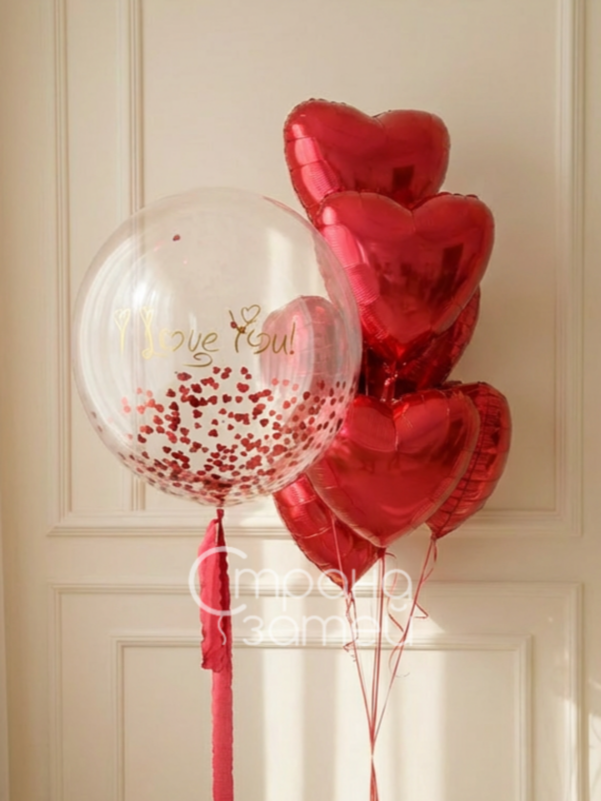 Бабл с надписью I Love You и конфетти плюс фонтан красных сердец. Для 14 февраля, годовщины и признания в любви. Доставка и самовывоз по Нижнему Новгороду.