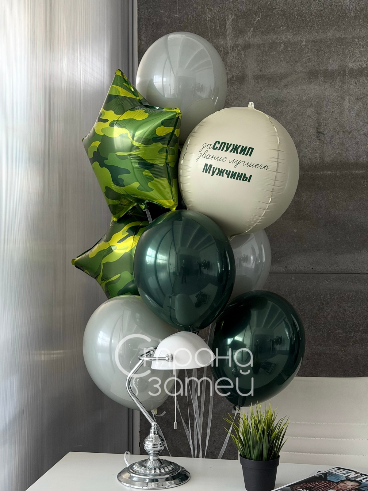 Фонтан со сферой с надписью, камуфляжными звёздами и дабл шарами создаёт мужское настроение и стильно смотрится на фотографиях.