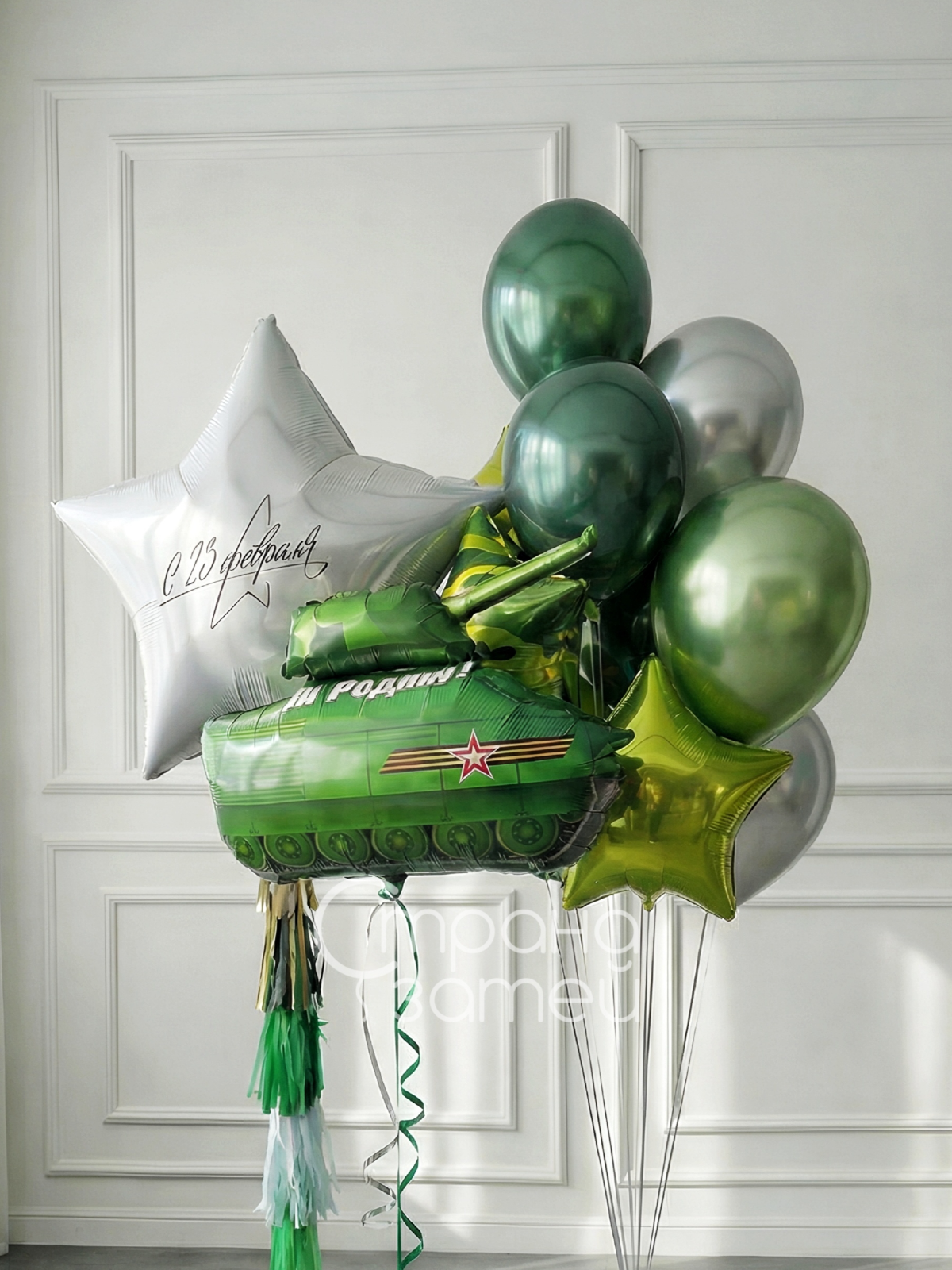 Серебряная звезда‑гигант с текстом и фонтан из звёзд и хромовых шаров стильно украшают пространство к 23 февраля и эффектно смотрятся на фото.