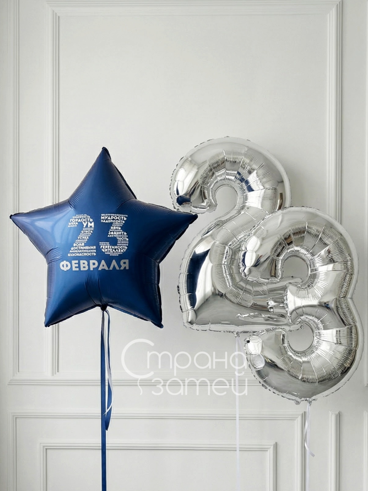 Синяя звезда‑гигант с надписью и серебряные цифры 23 создают аккуратный, современный акцент для оформления дома и офиса к празднику.