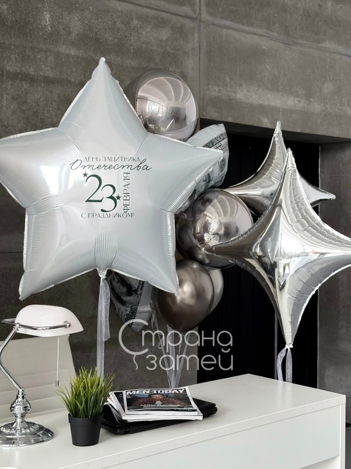 Серебристый звёздный сет с надписью и «долларовым» фоном создаёт атмосферу успеха и отлично смотрится на фотографиях.