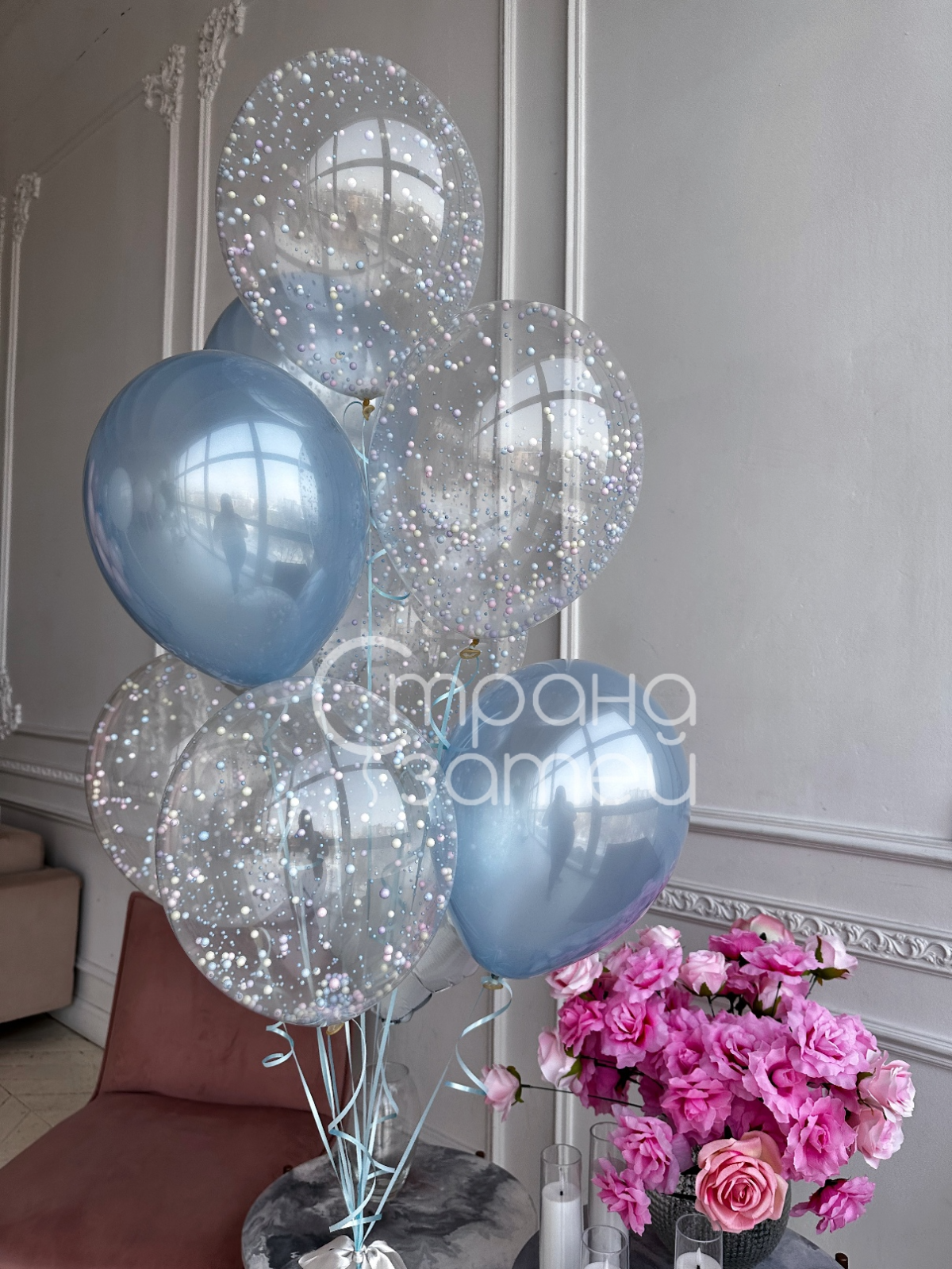 • Фонтан из 9 шаров: 5 прозрачных шаров с пенопластом, 3 латексных шара металлик, 1 фольгированный шар‑сердце 18″ / 45 см