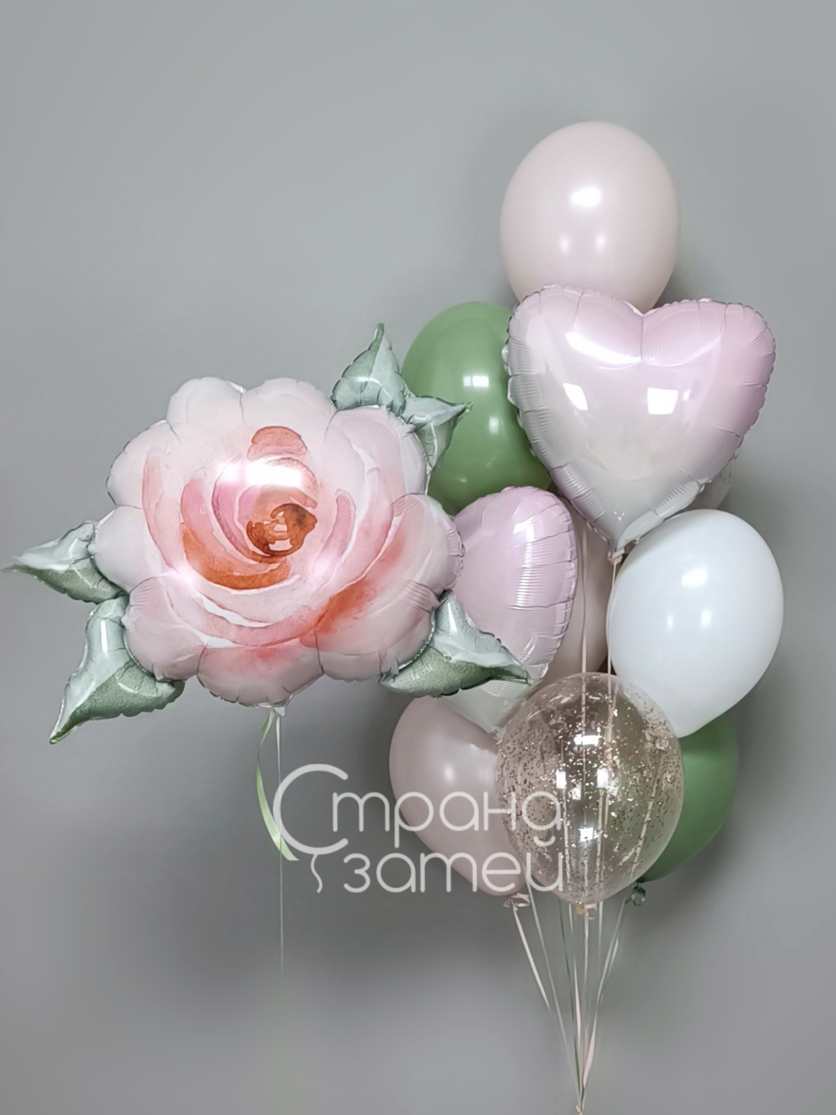 Сет с крупной розой и фонтоном из пастельных шаров, конфетти и сердец станет утончённым поздравлением на 8 Марта и лёгким оформлением дня рождения для неё, которое красиво смотрится на фотографиях.