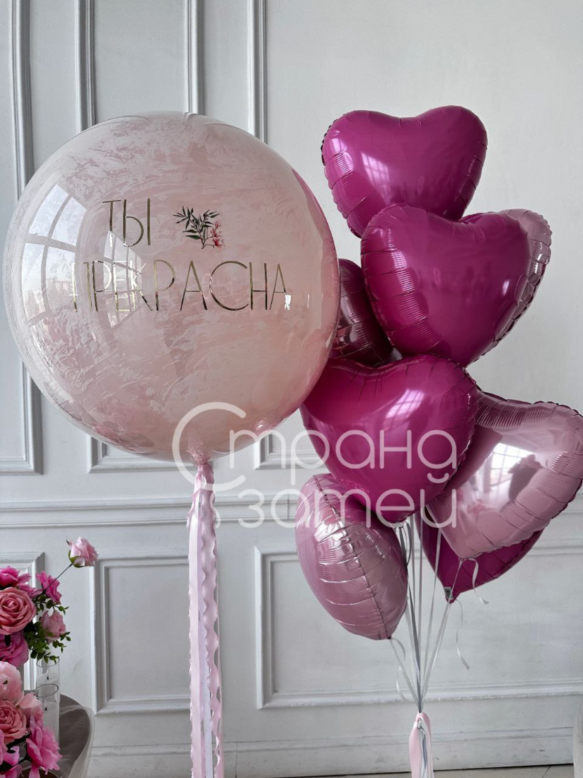 Розовое признание в шаре-гиганте и фонтоне сердец