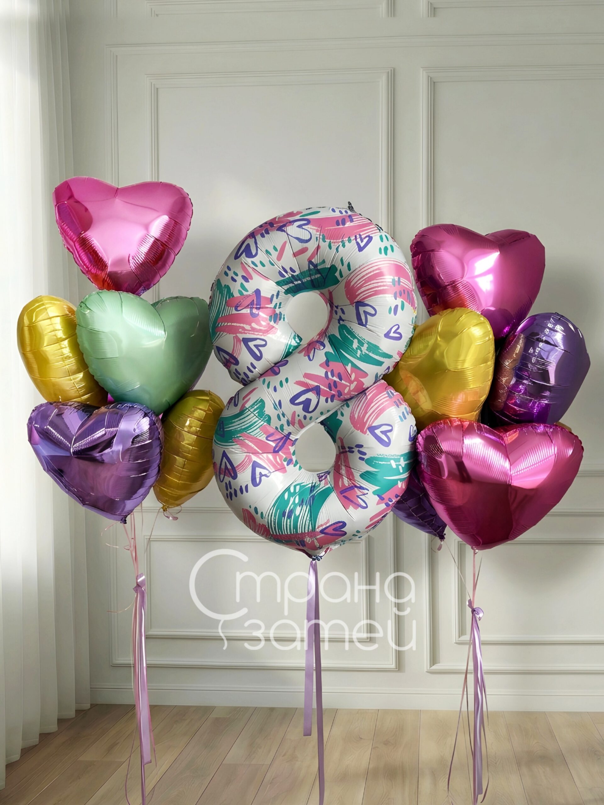 Яркая цифра и два фонтана из блестящих сердец создают праздничное оформление на 8 Марта и станут эффектным акцентом дня рождения для неё, который красиво смотрится на фотографиях.