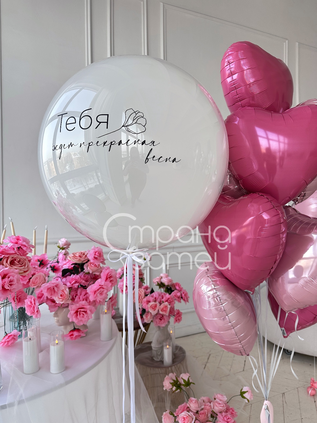 Большой дабл бабл с текстом и розовый фонтан из сердец на атласных лентах создают нежный акцент для 8 Марта и отлично смотрятся на фото дома и в офисе.