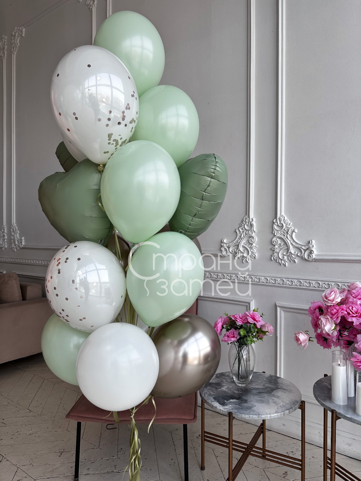 • Фонтан из 17 шаров на атласных лентах: 4 шара хром, 3 дабл шара пастель с конфетти, 3 фольгированных шара‑сердца 18″, 7 латексных шаров пастельНежный «Весенний комплимент»
