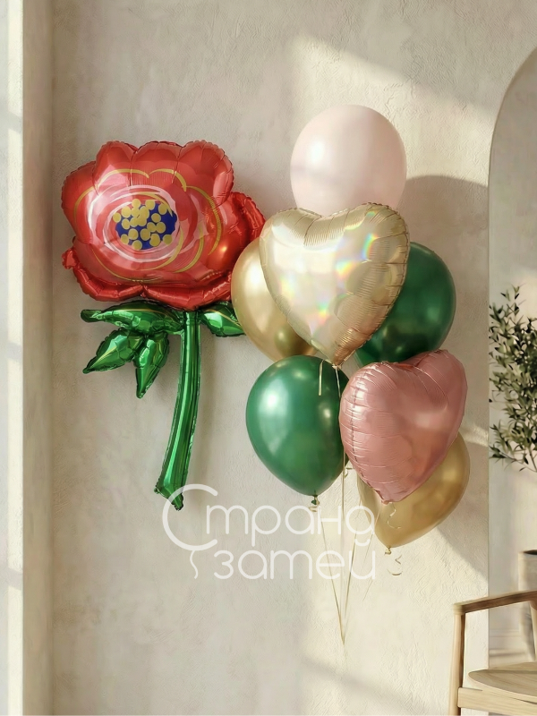 Сет с крупной красной розой и фонтоном из сердец, металлика и пастельных шаров станет элегантным украшением на 8 Марта и красивым акцентом на дне рождения для неё, который отлично смотрится на фотографиях.