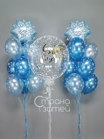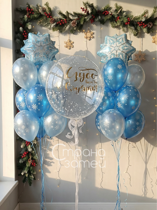 • 2 фонтана по 10 шаров, в каждом: 9 шаров с рисунком, фигура снежинка