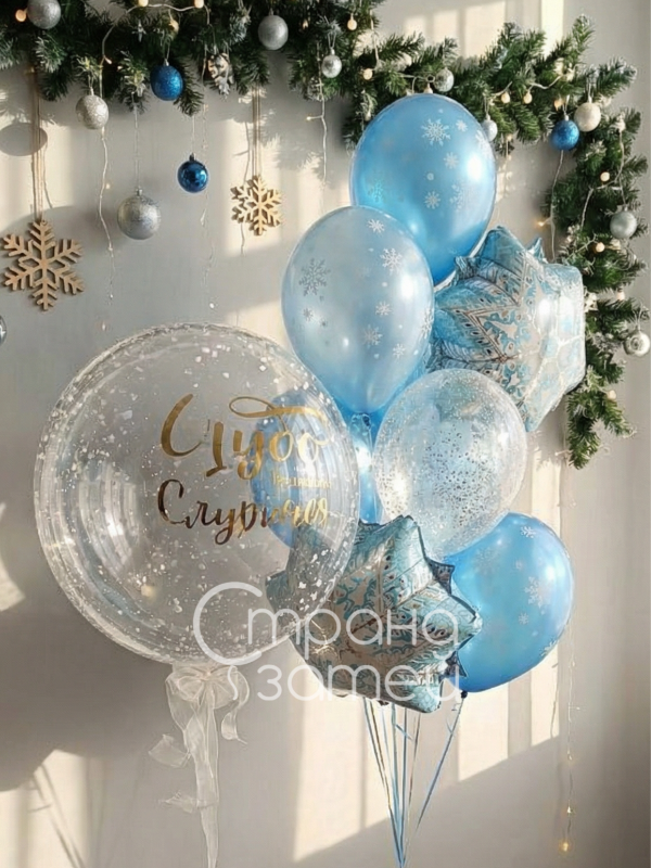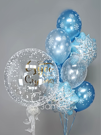 - Фонтан из 10 шаров: 2 снежинки, 2 с пенопластом, 5 с рисунком