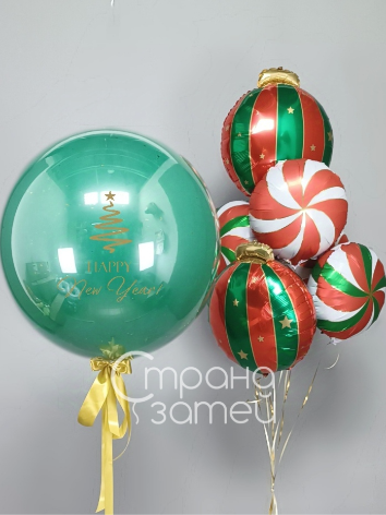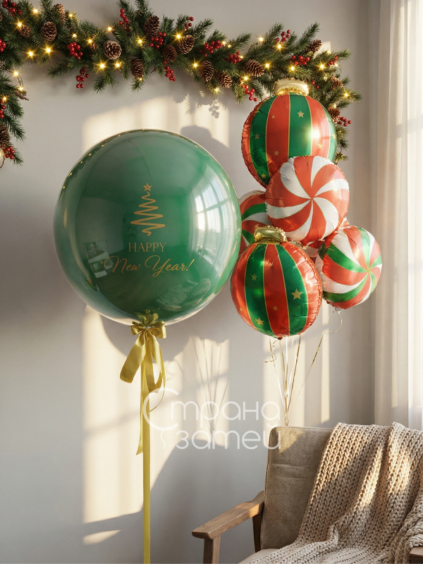 - Фонтан из 7 шаров: 2 ёлочных игрушки, 5 круг 18″