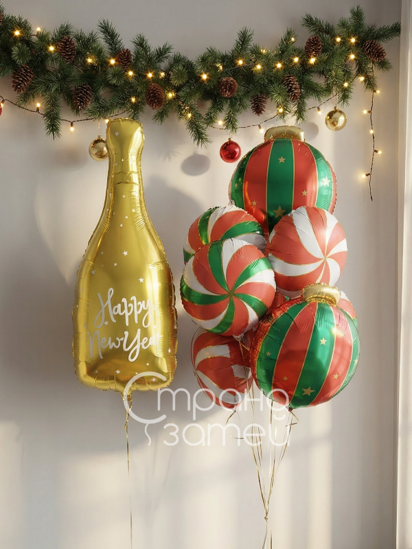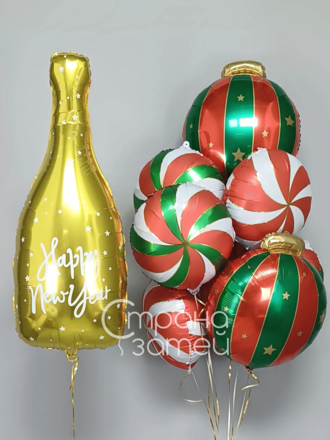 - Фонтан из 7 шаров: 2 ёлочных игрушки, 5 круг 18″