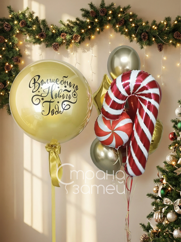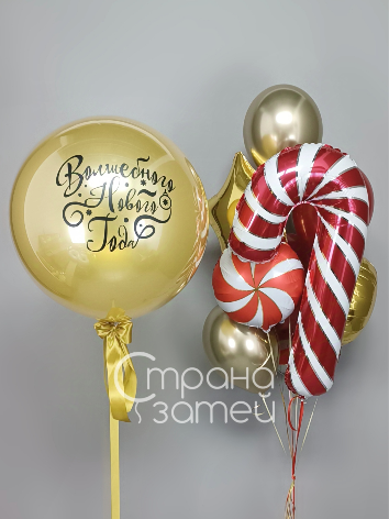 - Фонтан из 10 шаров: фигура карамелька, 2 круга 18″ с рисунком, звезда 18″, круг 18″, 5 хром