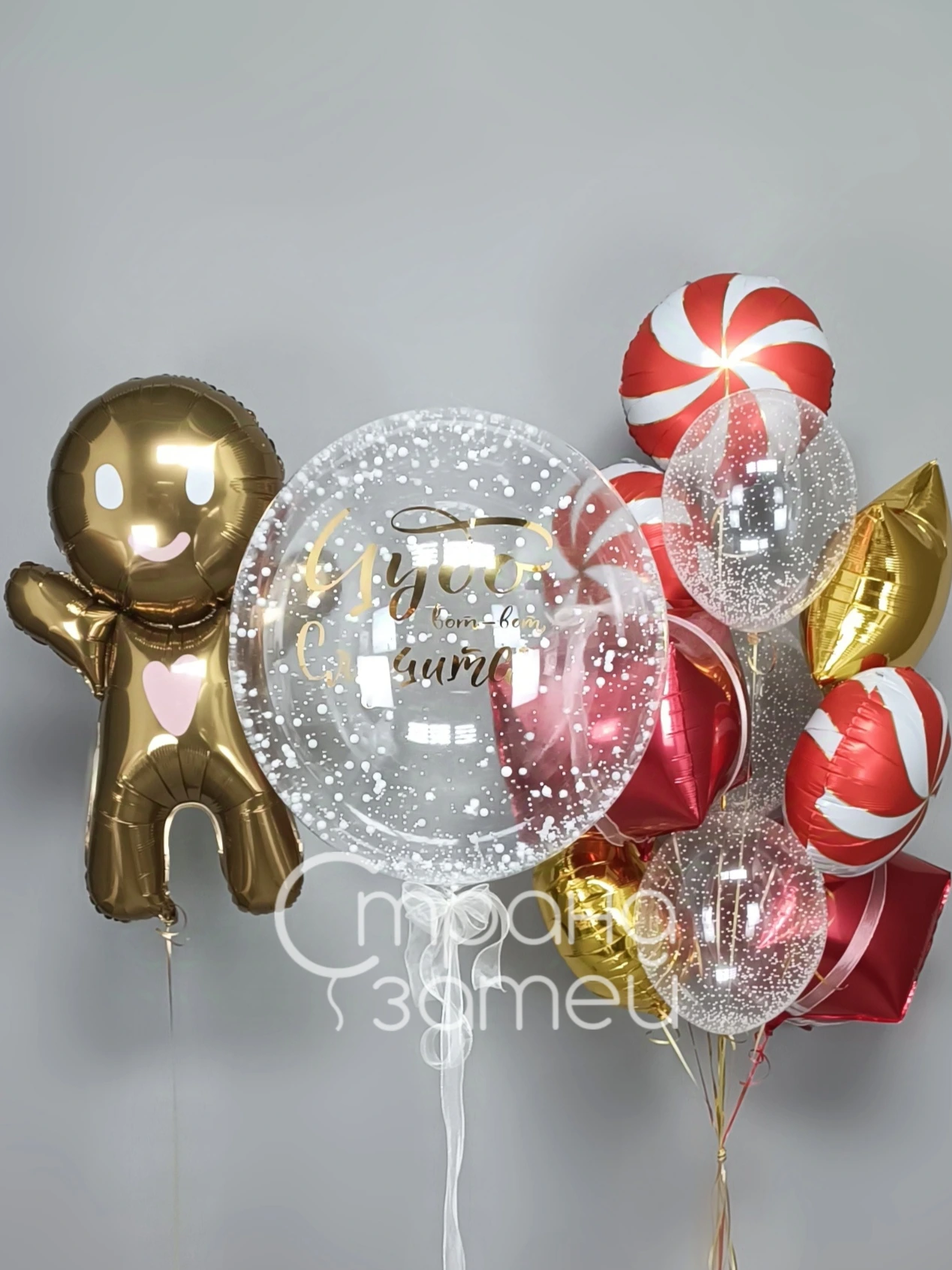 - Фонтан из 10 шаров: 3 с пенопластом, звезда 18″, круг 18″, 3 круга 18″ с рисунком, 2 куба с декором лентой