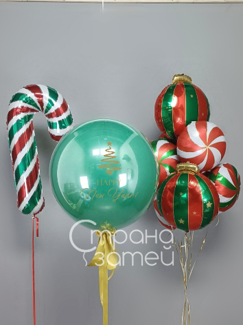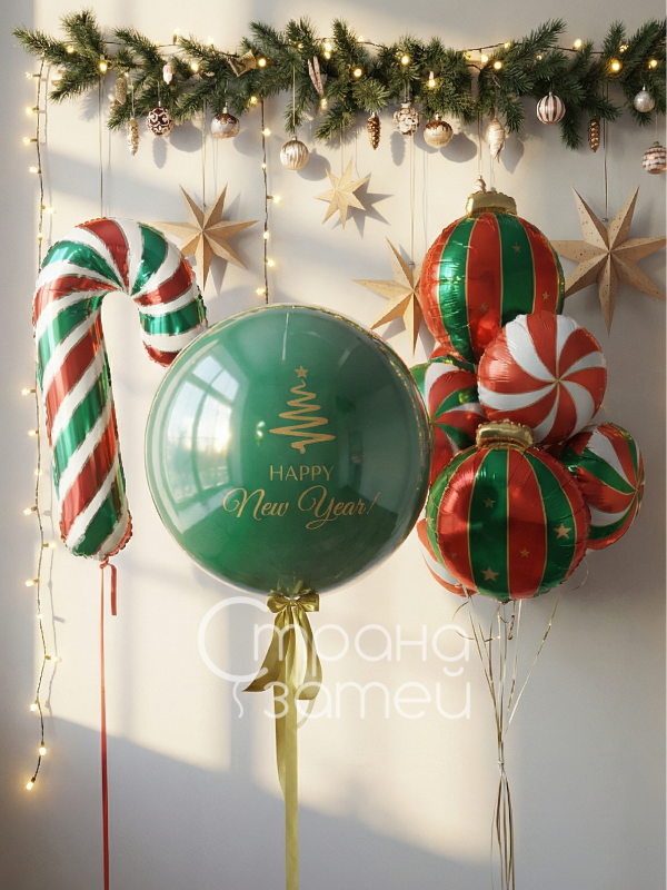 • Фонтан из 7 шаров: 2 ёлочных игрушки, 5 круг 18″