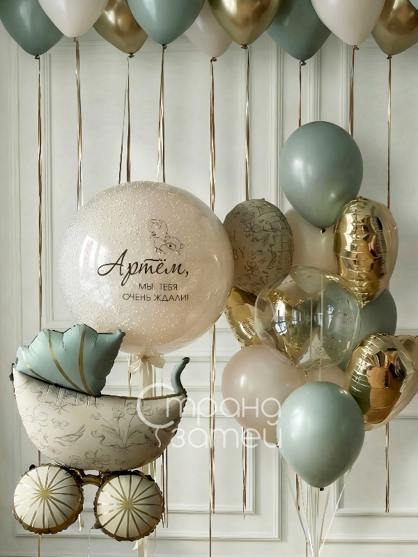 Нежный сет на выписку из роддома: метрика на шаре-гиганте, трогательная коляска, праздничный фонтан и шары под потолок с лентами-дождём. Оформим текст метрики и подберём оттенки под вашу историю.