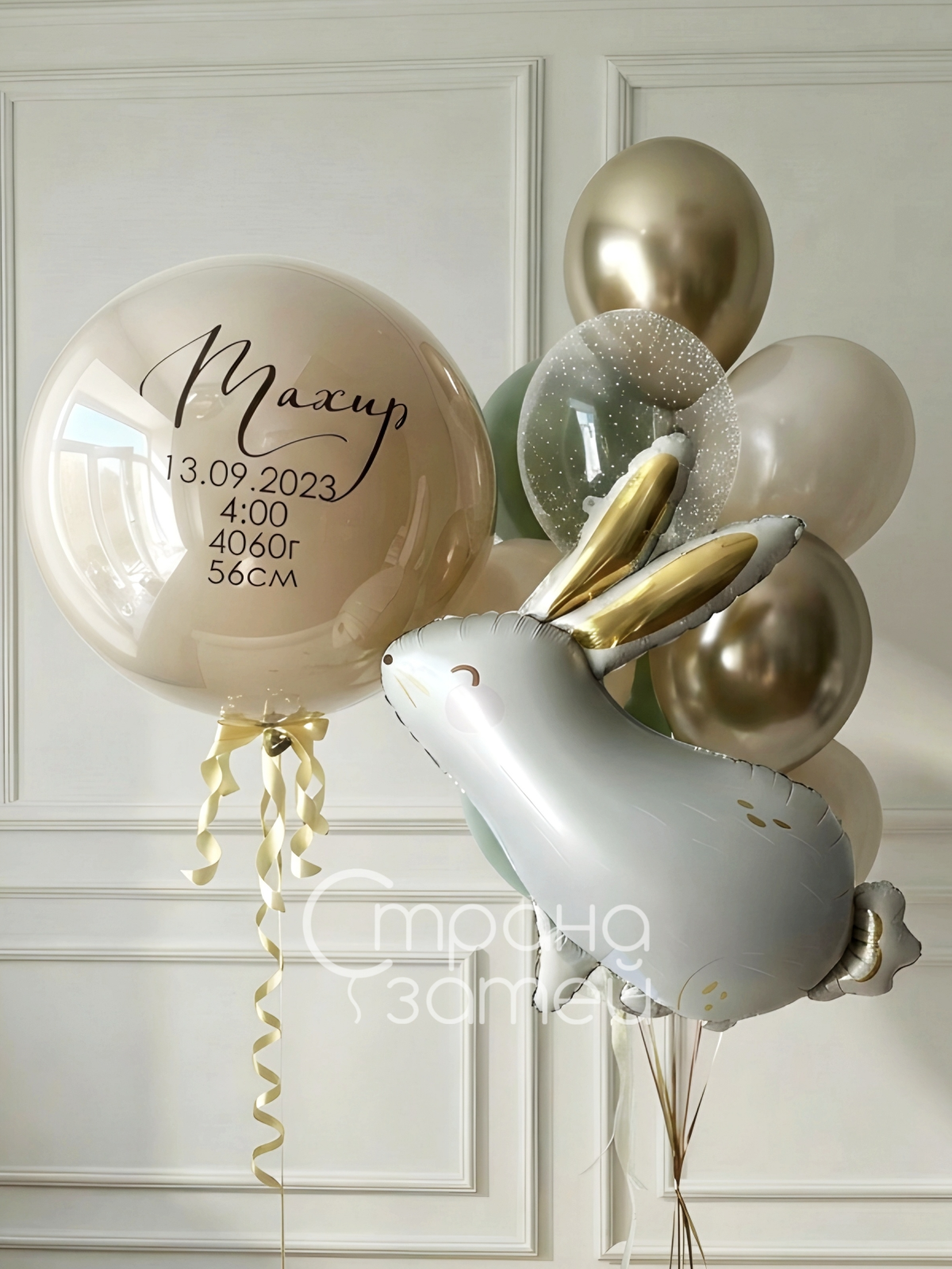 Сет «Зайкина метрика» — нежные шары на выписку из роддома с персональной метрикой на шаре-бабл. Цвет шаров и текст (имя, дата, время, вес, рост) можно изменить — под ваш стиль и вашу историю.